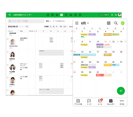 PCでもスマートフォンからでも個人の予定だけでなく、メンバーの予定も確認できます。所属組織のメンバーはもちろん、他チームのメンバーもお気に入りに設定すればスケジュールを簡単に確認できます。