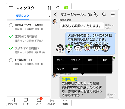 仕事で必要なコミュニケーションを1つのアプリでカバー。トークを中心に、すべての機能がスムーズに連携するので、使いやすい。