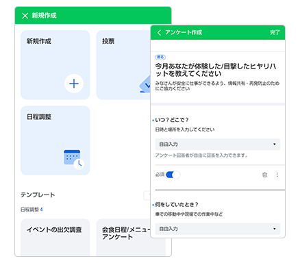 会食日程の調整から災害時の安否確認まで、すぐにアンケートを作成できるよう豊富なテンプレートがあらかじめ用意されています。
