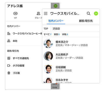 組織やチームごとに所属メンバーを一覧で表示。名前を覚えていない場合でも、組織からメンバーを検索できます。