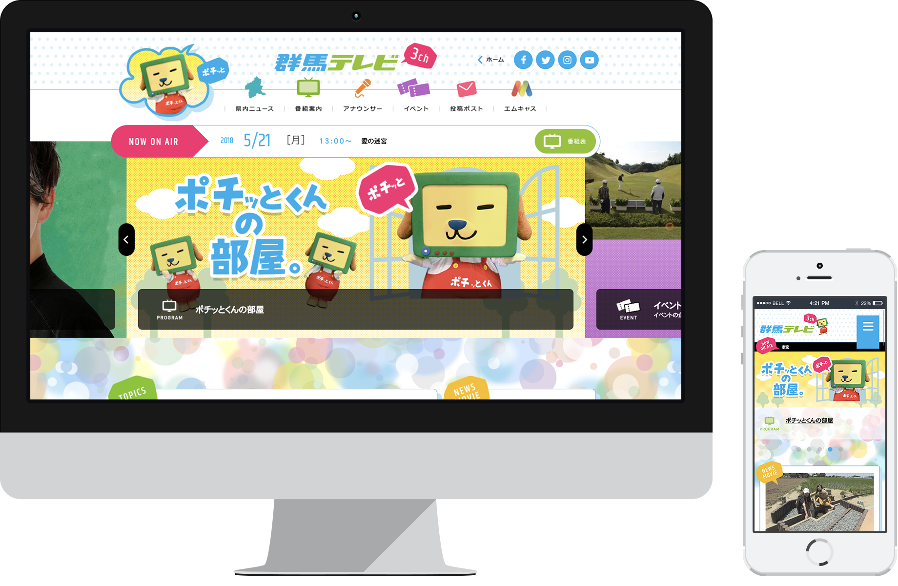 群馬テレビのマスコットキャラクター「ポチッとくん」を起用し、楽しく閲覧できるデザインに刷新。ポップな色使いとクリックしやすいボタンを採用し、見やすくも使いやすいデザインにしています。
