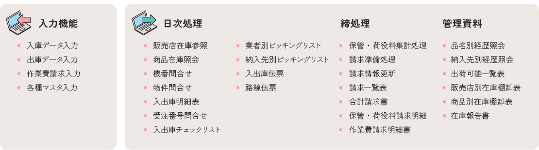 - 各種連携可能(荷主データ、Web在庫照会、HHT)