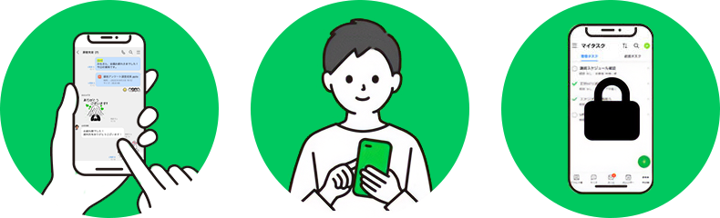 LINE WORKSは、LINEと同じような使い勝手で導入したその日から誰でもすぐに使えます。LINEおなじみのチャットやスタンプは、多くの現場で楽しい職場づくりをサポートしています。グループで共有できるノートや予定、フォルダの機能を活用すれば、無駄のないコミュニケーションも可能となり、LINEや他社のLINE WORKSユーザーとのトーク機能で、さらに社外とのつながりも広がります。